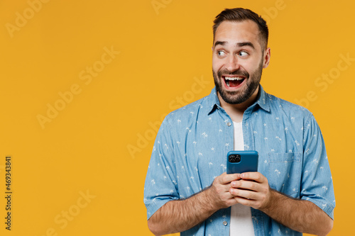 Young smiling happy caucasian man 20s wear blue shirt white t-shirt hold in hand use mobile cell phone chatting browsing look aside on workspace isolated on plain yellow background studio portrait