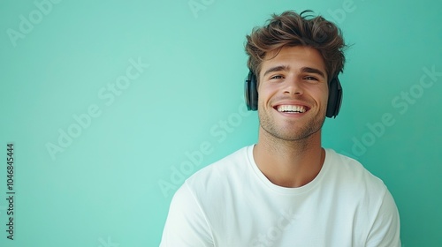 Young smiling happy satisfied man wear shirt white t-shirt casual clothes listen to music in headphones use mobile cell phone isolated on plain blue cyan background studio portrait. generative ai