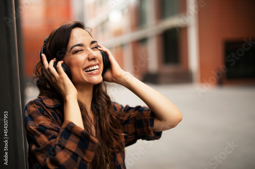 Young smiling woman with headphones outdoors. Beautiful happy girl listening the music.