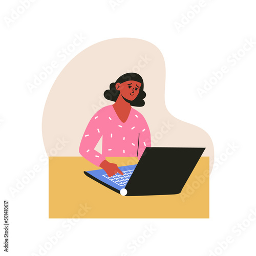 Young smiling woman working at table on laptop. Vector flat illustration in trendy colors, isolated on a white background