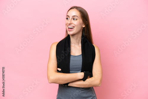 Young sport caucasian woman wearing a towel isolated on pink background happy and smiling