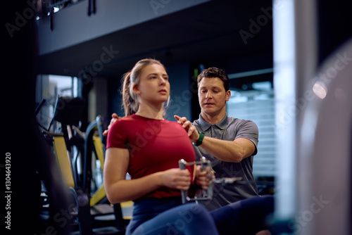 Young sportswoman using seated cable row machine during exercise class with fitness instructor.