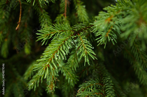 Young spruce needles in bright green color with water drops after spring rain. Branch of fir tree with raindrops close up. Macro photography of fresh green spruce needles with small raindrops