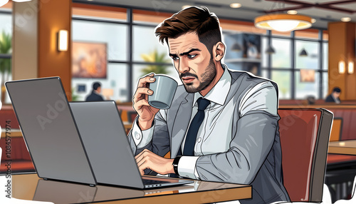 Young stressed nervous annoyed businessman sitting in cafeteria restaurant drinking coffee reluctantly looking at laptop computer monitor, unhappy and upset because of bad business decision isolated