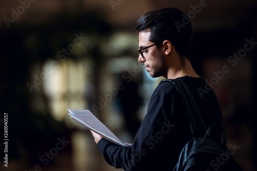 Young student of computer science consults some papers illuminated by the light of a screen in a corridor.