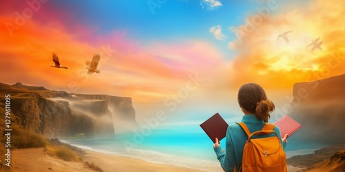 Young student with backpack holding two books enjoying inspiring colorful sunset at the cliffs by the sea with birds flying, concept of remigration and repatriation