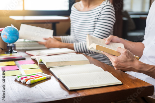 Young students classmates help friend catching up workbook and learning tutoring in a library, education and school concept