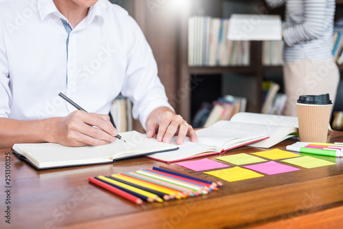 Young students classmates help friend catching up workbook and learning tutoring in a library, education and school concept