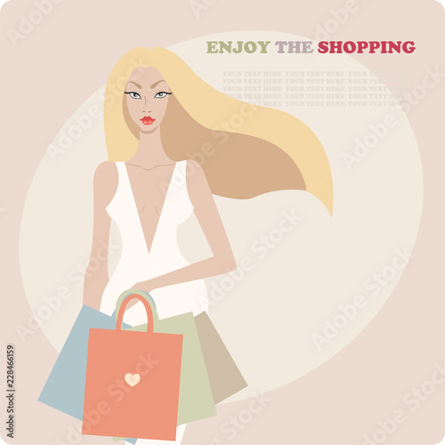 Young stylish beautiful woman wearing luxury dress and holding shopping bags. Fashion model vector illustration.Sale,perfect buys,boutique,shop.