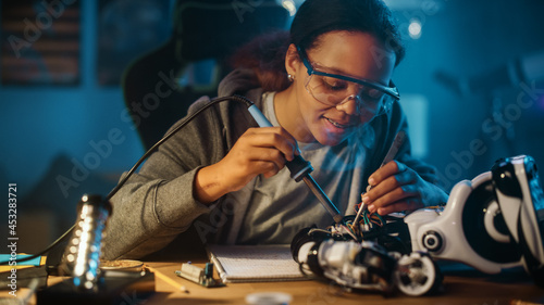 Young Teenage Multiethnic Schoolgirl is Studying Electronics and Soldering Wires and Circuit Boards in Her Science Hobby Robotics Project. Girl is Working on a Robot in Her Room. Education Concept.