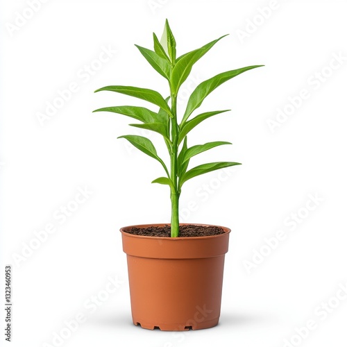 Young vibrant green plant in a terracotta pot against a white background. The plant has bright, healthy leaves and appears to be a sapling.