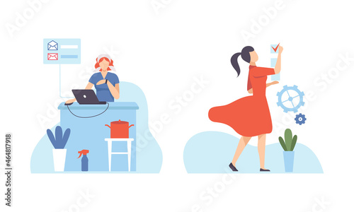 Young Woman at Laptop Networking and with Check Box Vector Set