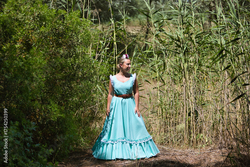 Young woman, beautiful, blonde, with typical Andalusian flamenco costume to go on pilgrimage in light blue color, posing in the middle of the field. Concept regional costumes, typical, Spanish.