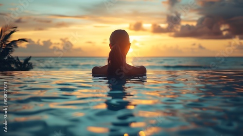 Young woman enjoying the edge of the water of a luxurious infinity pool merging with the horizon on the background of the sea in a tropical warm sea resort : Generative AI