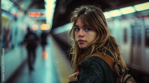 Young woman in a subway station looking back while waiting for the train at dusk. Generative AI