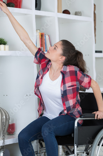 young woman in wheelchair selecting book in the library