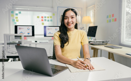 Young woman is sitting at her desk and smiling while writing something down in her notebook. She is wearing headphones and working on a laptop