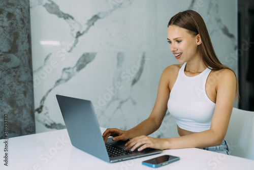 Young woman looking her laptop while holding a cup of coffee in the kitchen at home.