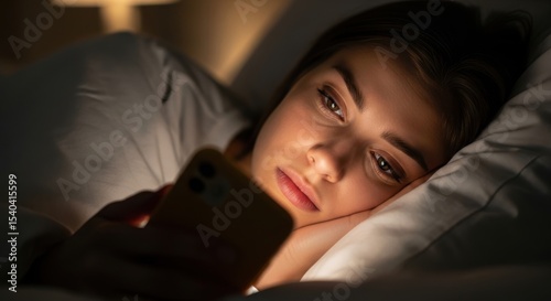Young woman lying in bed at night, illuminated by the glow of her smartphone screen.