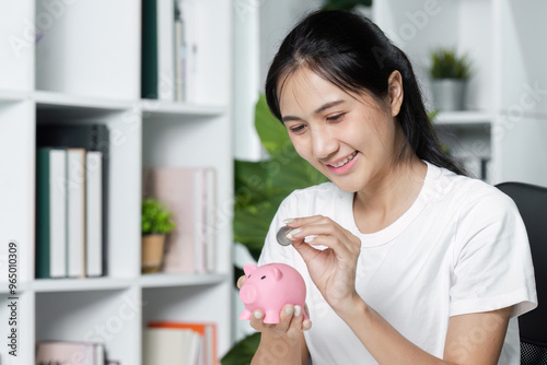 Young Woman Saving Money by Putting Coin into Pink Piggy Bank at Home Office