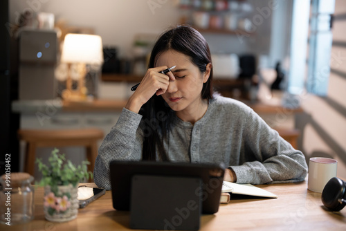 Young woman sits at her desk with a laptop open at home, looking stressed and holding her head.