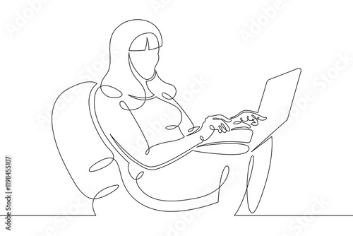 Young woman sits working at a laptop computer. The designer manager works on the Internet. One continuous drawing line, logo single hand drawn art doodle isolated minimal illustration.