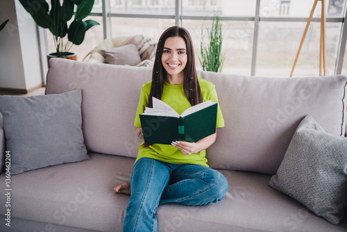 Young woman sitting casually on a sofa at home, reading a green book, feeling relaxed and happy in a modern and comfortable living space