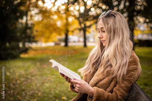 Young woman sitting in the park on a bench and reading a book. In the background are beautiful autumn colors.