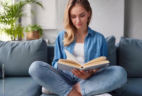 Young woman sitting on couch with crossed legs reading a book in denim shirt Sofa in home interior