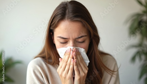 Young woman sneezing into tissue. Health, illness concept. Allergy, common cold symptoms. Female runny nose, blowing handkerchief, allergy problems. Girl with flu uses paper napkin, feels unwell,