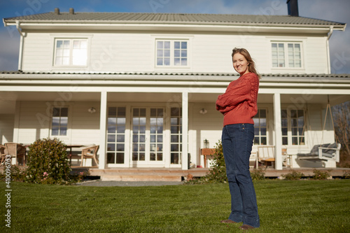 Young woman standing in front of house