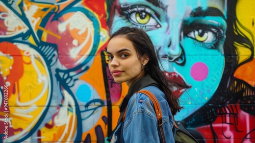 Young woman standing next to colorful graffiti mural with vibrant colors and portrait, outdoor urban art, city scene, vivid street art background