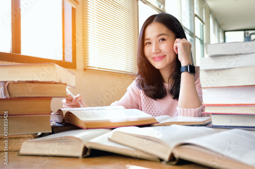 Young woman taking note and studying in library