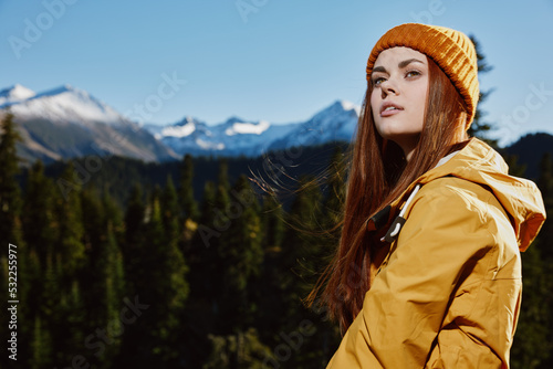 Young woman tourist portrait in yellow raincoat traveling and hiking in the mountains. Hiking in nature in the sunset