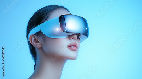 Young woman wearing white virtual reality headset. Experiencing a tranquil virtual environment. Advanced technology in real life.