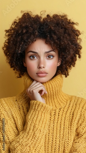 Young woman with curly afro hair poses with a concerned expression, touching her chin, exuding worry and deep thought against a yellow studio background