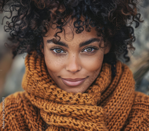 Young woman with curly hair and a cozy sweater. Warm tones composition.