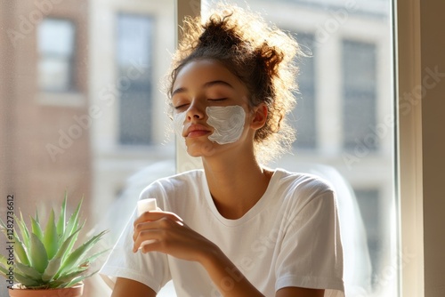 Young woman with curly hair applying a face mask, enjoying a relaxing skincare routine by the window.