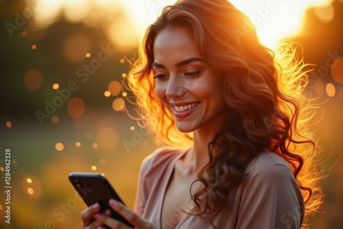 Young woman with curly hair smiling using smartphone texting in golden hour outdoor nature setting perfect for social media, technology, lifestyle concepts, warm sunlight, natural background