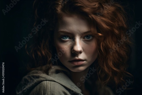 young woman with expressive blue eyes and wispy curly red hair created with Generative AI technology