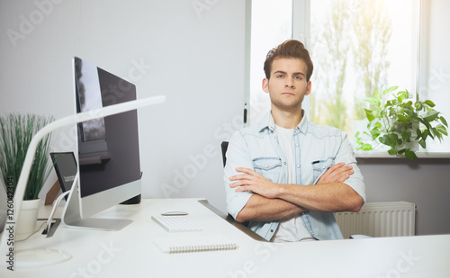 Young worker sitting in an office at the computer. Freelancer in a white shirt. The designer sits in front of window in the workplace.