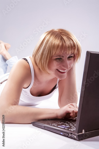 Youth Lifestyle and Technologies Concepts. Excited and Laughing Caucasian Blond Woman With Laptop Against White Backgound on Floor Chatting.