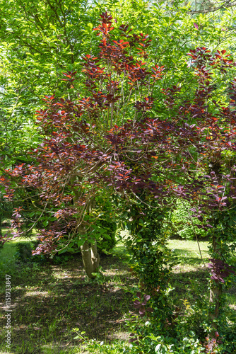 YRed leaves of Cotinus coggygria Royal Purple (Rhus cotinus, European smoke tree) glow in sun Young red leaves on branches of European smoke tree on blurred background of greenery. Selective focus.