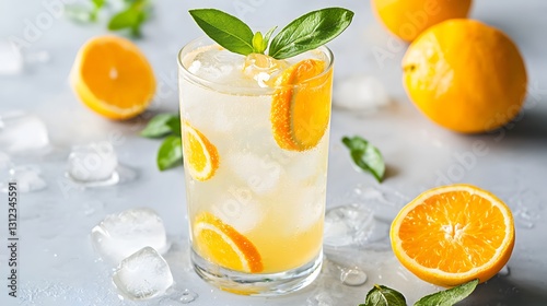 Yuzu soda in a tall glass, fresh citrus slices and ice cubes