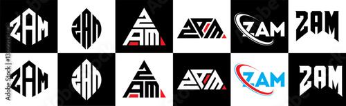 ZAM letter logo design in six style. ZAM polygon, circle, triangle, hexagon, flat and simple style with black and white color variation letter logo set in one artboard. ZAM minimalist and classic logo