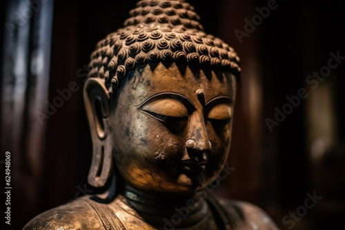Zen spiritual ritual meditating white face of bronze Buddha, dark background. Spiritual awakening. Statue of Buddha in temple and a small meditation. Religion concept, esoterics. Generative AI.