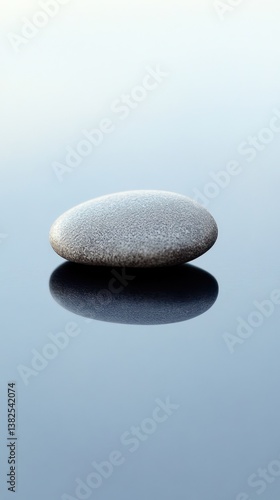 Zen stone resting on a reflective surface under subtle, soft lighting