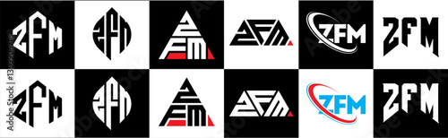ZFM letter logo design in six style. ZFM polygon, circle, triangle, hexagon, flat and simple style with black and white color variation letter logo set in one artboard. ZFM minimalist and classic logo
