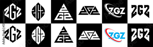 ZGZ letter logo design in six style. ZGZ polygon, circle, triangle, hexagon, flat and simple style with black and white color variation letter logo set in one artboard. ZGZ minimalist and classic logo