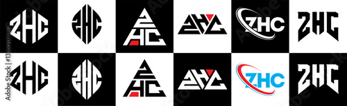 ZHC letter logo design in six style. ZHC polygon, circle, triangle, hexagon, flat and simple style with black and white color variation letter logo set in one artboard. ZHC minimalist and classic logo